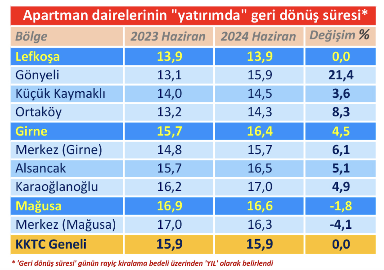 Giynik gazetesinden Artun Çağa imzalı habere göre Kuzey Kıbrıs’ta yatırım olarak satın alınan ve kiralanan bir apartman dairesinin yatırım karşılığını verme süresi 2024 yılının 2. çeyreğinde (Haziran) ortalama 15.9 sene şeklinde belirlendi. 101evlercom emlak satış sitesinin verilerine göre dönüş süresi yıllık bazda aynı kalırken, bir önceki çeyreğe göre (Mart 2024) düştü. Emlak çevreleri, “yatırım karşılığını verme süresinin” artan ya da düşen daire fiyatları ile kiralık taleplerinin değişimine bağlı olduğunu anımsatıyor.