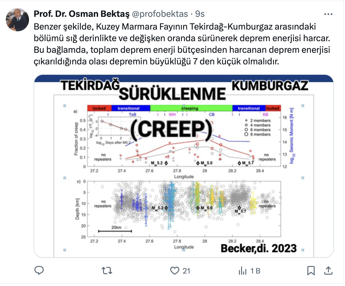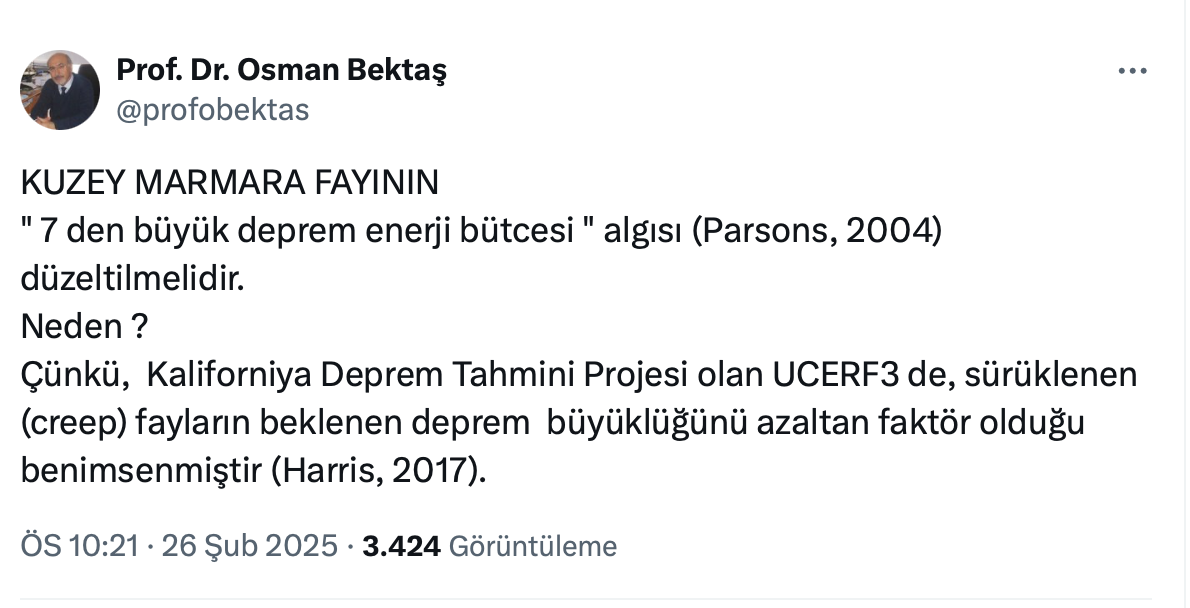Prof. Dr. Bektaş yaptığı paylaşımda Kuzey Marmara Fayı’nın 7’den büyük deprem enerji bütçesi algısı neden düzeltilmesi gerektiğini açıkladı.