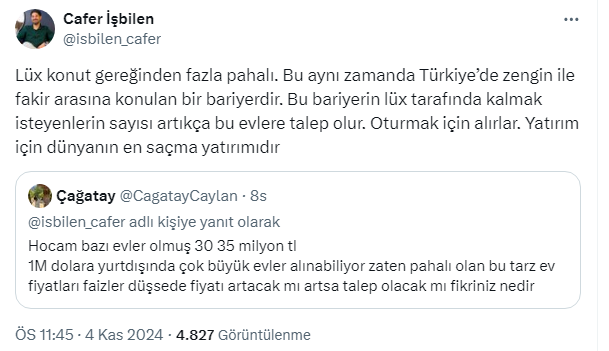 Lüks konutların fiyatlarının 35 milyon liraya kadar yükseldiğini aktaran analist Cafer İşbilen, bu durumun zengin ile fakir arasında bir bariyer olduğunu açıkladı.