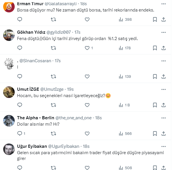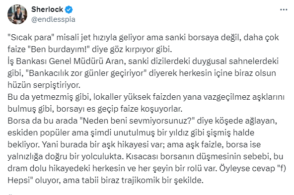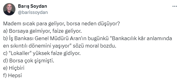 Borsa İstanbul'da BIST 100 endeksi, güne yüzde 0,26 yükselerek 10.274 puandan başladı. Borsadaki yükselişe rağmen birçok hisse de düşüş ve yatay hareket sürüyor. Ekonomi gündeminde yurt dışından sıcak para girişinin arttığı konuşulurken Ekonomist Barış Soydan, https://twitter.com/barissoydan X sosyal medya üzerinden yaptığı paylaşımda, madem sıcak para geliyor borsa neden düşüyor? diye sordu. Borsadaki düşüsün nedeniyle ilgili 6 şıktan oluşan bir soru hazırladı.