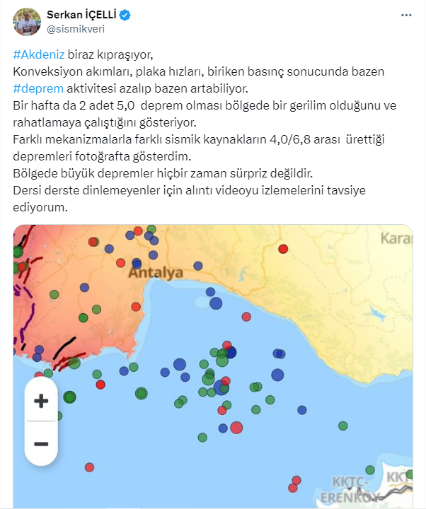İçelli, sosyal meyda hesabından Akdeniz Bölgesi için kritik açıklamalarda bulundu. 'Bölgede büyük depremler hiçbir zaman sürpriz değildir.' diyen İçelli, bir hafta da 2 adet 5,0 deprem olması bölgede bir gerilim olduğunu ve rahatlamaya çalıştığını söyledi.