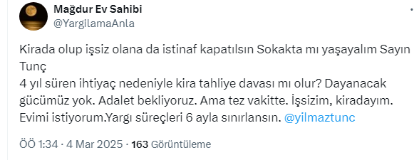 Mağdur ev sahipleri, kiracılarıyla yaşadıkları sorunları sosyal medyaya taşımaya devam ediyor. Ev sahipleri kiracıların evlerini adeta rehin aldıklarını söyleyerek, tahliye davalarının çok uzun sürmesinden şikayetçi. Mağdur bir ev sahibi, kirada olduğunu ve işi olmadığını söyleyerek, 4 yıl süren tahliye davasını işaret ederek Bakan Tunç'a seslendi.