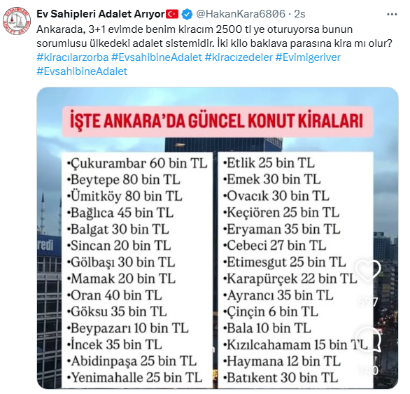 Ankarada, 3+1 evimde benim kiracım 2500 tl ye oturuyorsa bunun sorumlusu ülkedeki adalet sistemidir. İki kilo baklava parasına kira mı olur?