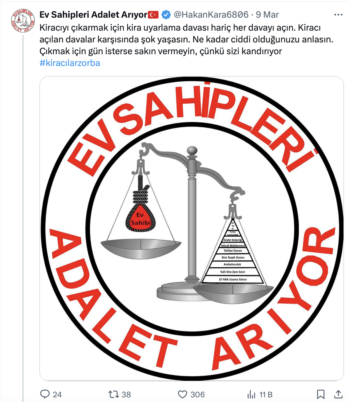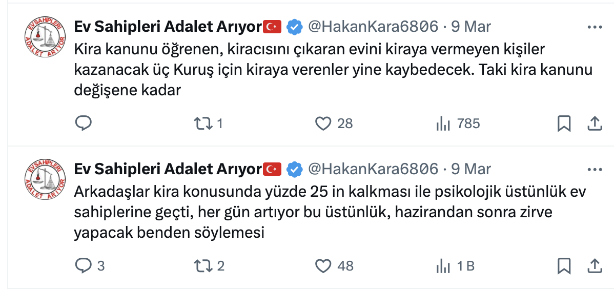 Mağdur ev sahibi Hakan Kara sosyal medya hesabı https://x.com/HakanKara6806 üzerinden yaptığı paylaşımda “Kiracıyı çıkarmak için kira uyarlama davası hariç her davayı açın” dedi.
