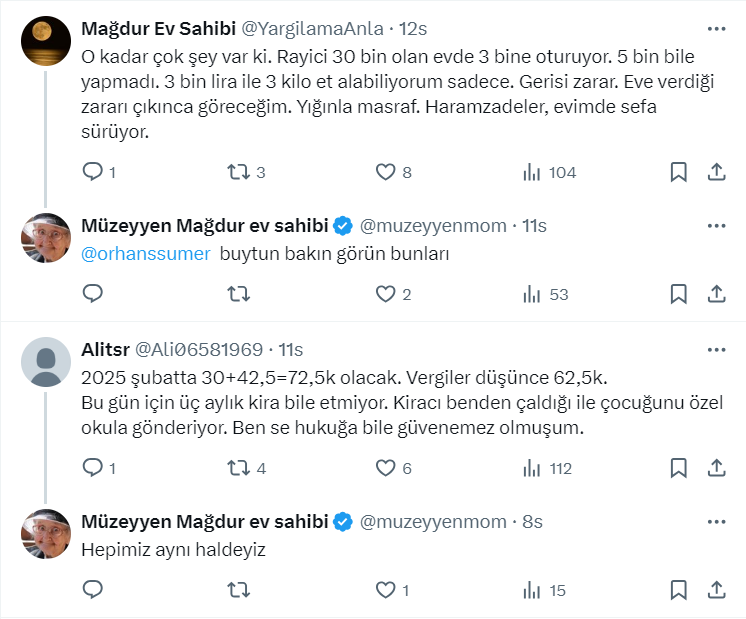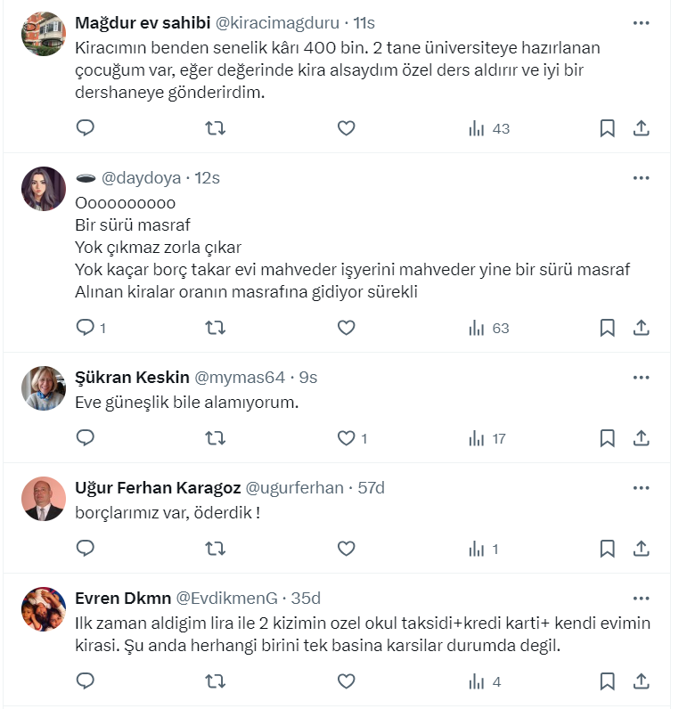 Ev sahipleri yaptıkları paylaşımlarda yüzde 25 sınırından dert yanarken, kiracılar da hem ev bulamamaktan hem de yüksek kiralardan şikayet ediyor.