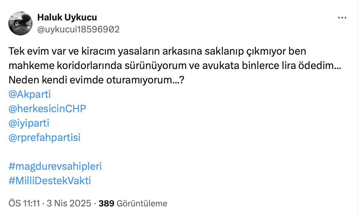 Mağdur ev sahibi Haluk Uykucu yaptığı paylaşımda Ak Parti, Cumhuriyet Halk Partisi, İyi Parti ve Yeniden Refah Partisi’ne seslenerek, “Neden kendi evimde oturamıyorum?” diye sordu.