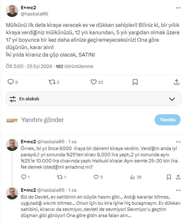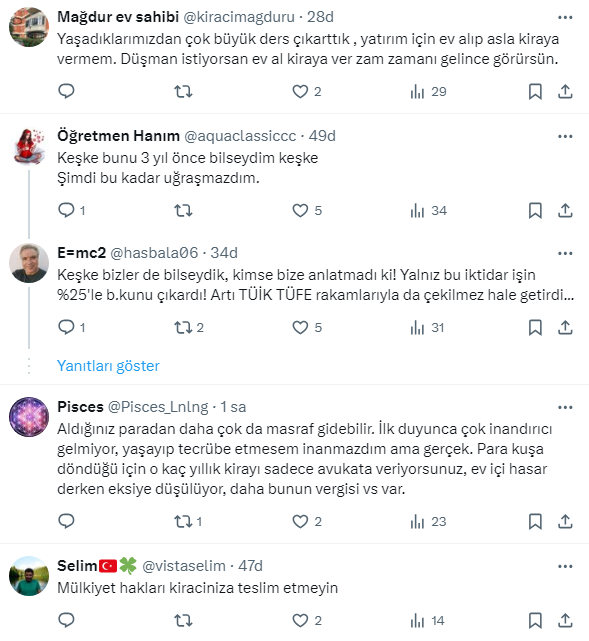 Mağdur ev sahiplerinden Hasbala06 sosyal medya hesabından ev sahiplerinin mağduriyetini dile getirerek evini yeni kiraya verecekleri uyardı. Mağdur ev sahibi, ''İki yılda kiranız da çöp olacak, satın' diyerek, ev sahiplerine seslendi. Bunun nedenini ise şöyle açıkladı ''Bir yıllık kiraya verdiğiniz mülkünüzü, 12 yılı kanundan, 5 yılı yargıdan olmak üzere 17 yıl boyunca bir kez daha elinize geçiremeyeceksiniz!' dedi.