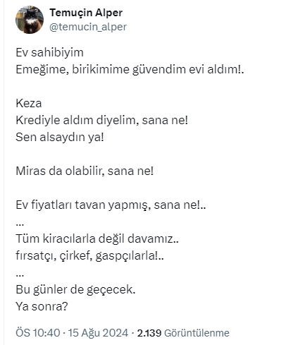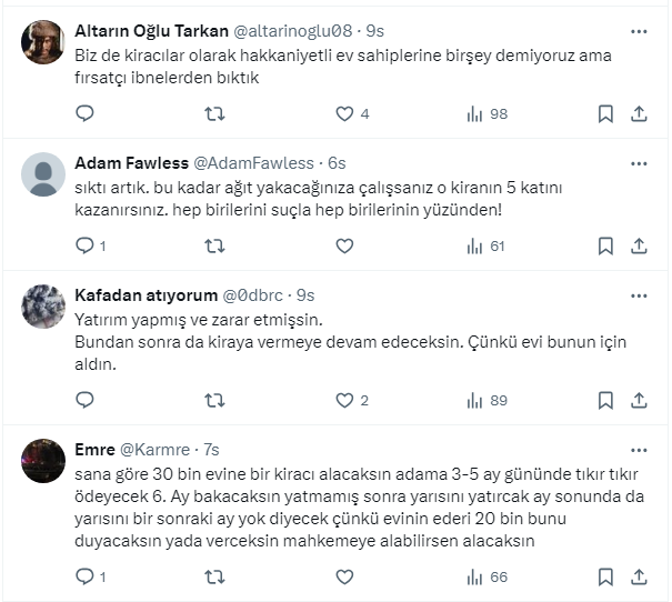 Kiracılarla aralarındaki barışın olabileceğine inanamayan ev sahibi Temuçin Alper sosyal medya hesabı X'ten fırsatçı kiracılara seslendi. İşte o paylaşım ve gelen yorumlar...