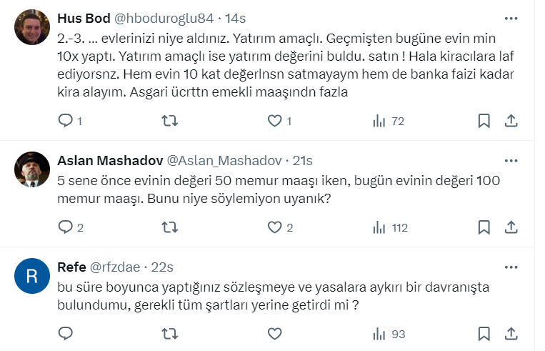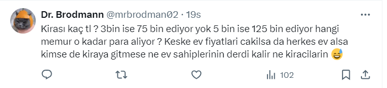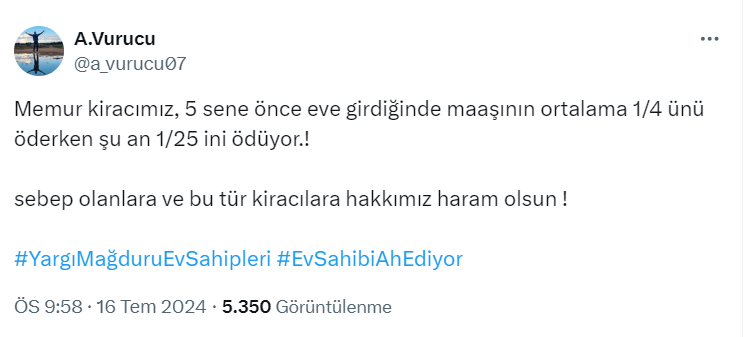 A.Vurucu, sosyal medya hesabı https://x.com/a_vurucu07 üzerinden yaptığı paylaşımda memur kiracısının, 5 sene önce eve girdiğinde maaşının ortalama 1/4 ünü öderken şu an 1/25 ini ödediğini söyledi.