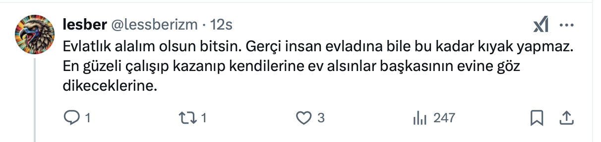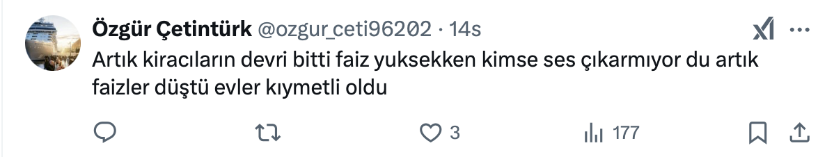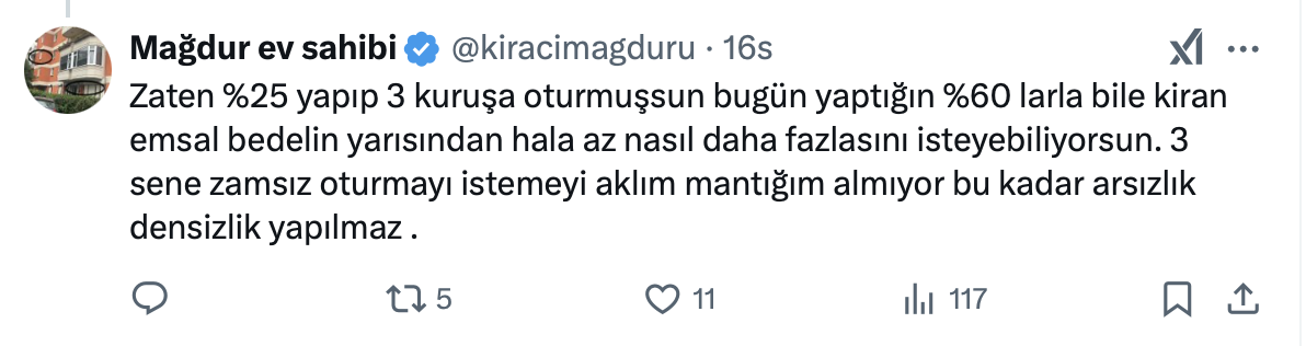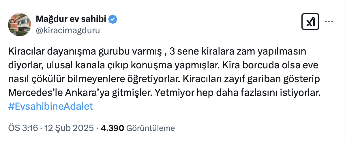 Kiracı mağduru ev sahibi, sosyal medya hesabı https://x.com/kiracimagduru üzerinden yaptığı paylaşımda kiracıların dayanışma grubu olduğunu belirterek, “3 sene kiralara zam yapılmasın diyorlar, ulusal kanala çıkıp konuşma yapmışlar. İfadelerini kullandı.