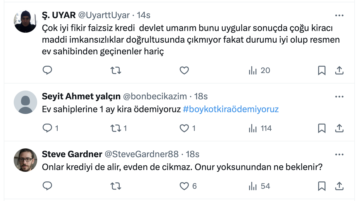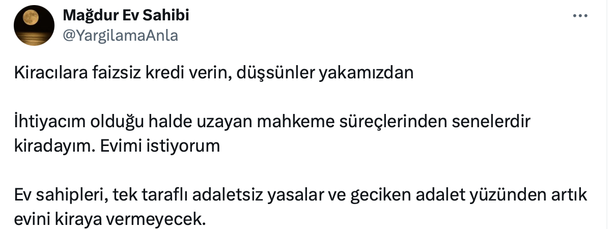 Mağdur ev sahibi sosyal medya hesabı https://x.com/YargilamaAnla üzerinden bir paylaşım yaparak, “Kiracılara faizsiz kredi verin, düşsünler yakamızdan” dedi.