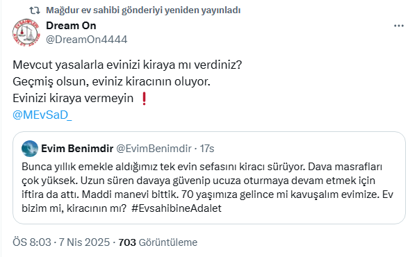 ''Bunca yıllık emekle aldığımız tek evin sefasını kiracı sürüyor. Dava masrafları çok yüksek. Uzun süren davaya güvenip ucuza oturmaya devam etmek için iftira da attı. Maddi manevi bittik. 70 yaşımıza gelince mi kavuşalım evimize. Ev bizim mi, kiracının mı? #EvsahibineAdalet''