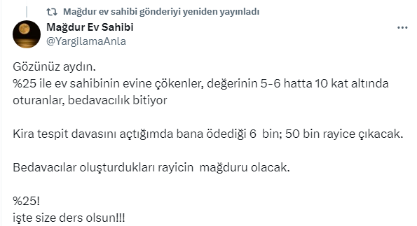 Mağdur ev sahibi isimi twitter kullancısı sosyal medya hesabından ev sahiplerinin evlerine kavuşmasını kutlayarak kiracılara ''Yüzde 25!