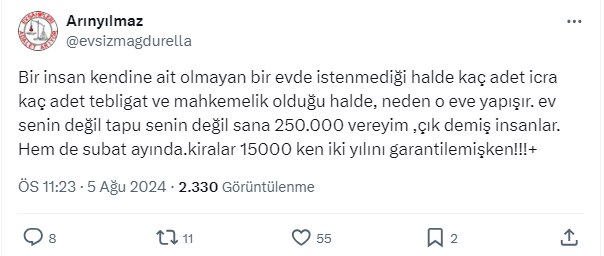 Bir insan kendine ait olmayan bir evde istenmediği halde kaç adet icra kaç adet tebligat ve mahkemelik olduğu halde, neden o eve yapışır. ev senin değil tapu senin değil sana 250.000 vereyim ,çık demiş insanlar. Hem de subat ayında.kiralar 15000 ken iki yılını garantilemişken!!!+
