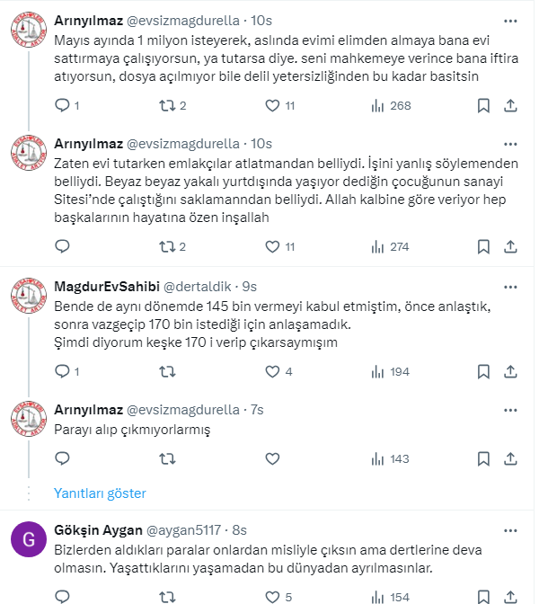 Mahkemeler kiracı ve ev sahibi olayları ile dolup taşarken, ev sahipleri çeşitli kaynaklardan seslerini duyurmaya çalışıyor. Arın Yılmaz isimli mağdur ev sahibi de kiracısıyla başından geçen olayı anlattı. Kirasına evini boşaltmasını isteyen ev sahibi mağdur oldu. Kiracı evden çıkması için ev sahibinden para istedi. İşte Arın Yılmaz'ın sosyal medya hesabı X'ten yaptığı o paylaşım ve gelen yorumlar...