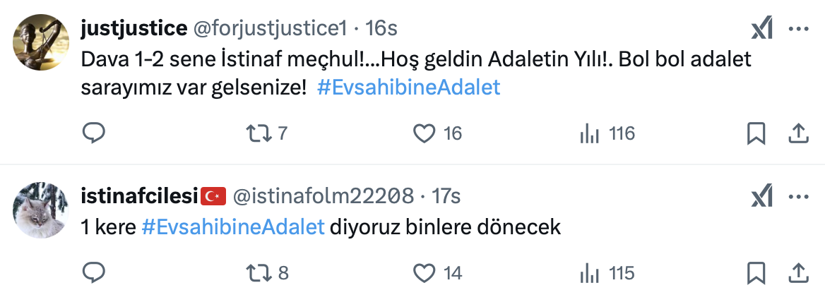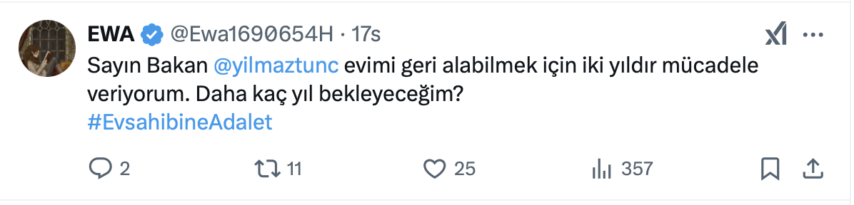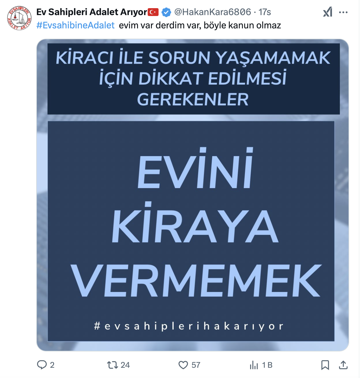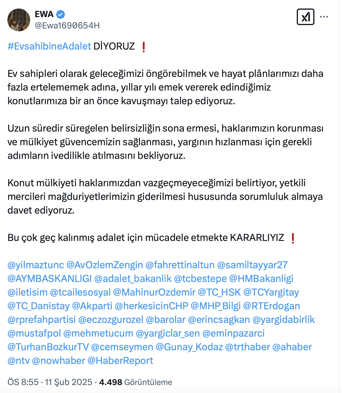 Mağdur ev sahibi, sosyal medya hesabı https://x.com/Ewa1690654H üzerinden yaptığı paylaşımda “#EvsahibineAdalet diyoruz” diyerek, “Ev sahipleri olarak geleceğimizi öngörebilmek ve hayat plânlarımızı daha fazla ertelememek adına, yıllar yılı emek vererek edindiğimiz konutlarımıza bir an önce kavuşmayı talep ediyoruz.” İfadelerini kullandı.