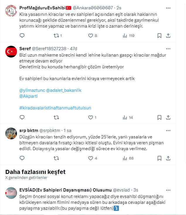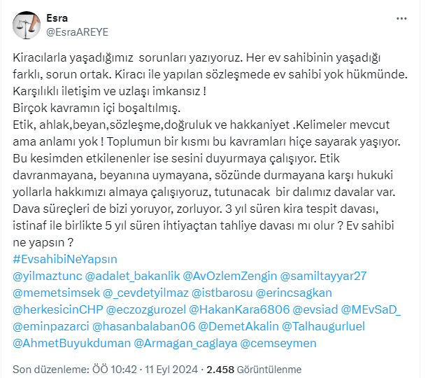 Ev sahibi Esra, sosyal medya hesabından bakanlığa seslenerek, çözüm istedi. İşte mağdur ev sahibinin sosyal medya hesabı X'ten yaptığı o paylaşım...