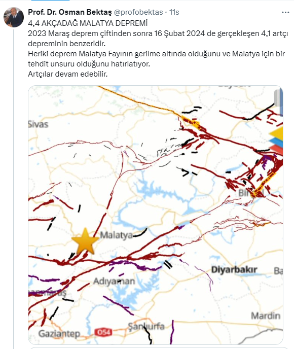 Prof. Dr. Osman Bektaş, sosyal medya hesabı X'ten yaptığı açıklamada, depremi artçı olarak değerlendirirken Malatya Fayı'na dikkati çekti. Bektaş, son depremleri "Malatya için tehdit unsuru" olarak yorumladı. Bektaş şunları söyledi:
