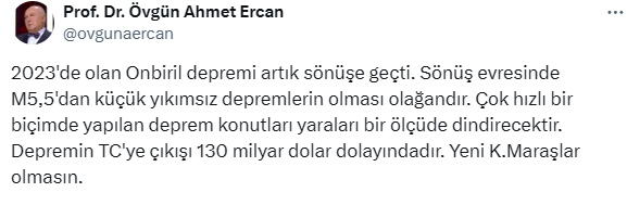 Prof. Dr. Övgün Ahmet Ercan ise Malatya'daki depremi "artçı" olarak değerlendirdi. Ercan ise söz konusu depremle ilgili şu açıklamalarda bulundu: "2023'de olan 11 il depremi artık sönüşe geçti. Sönüş evresinde M5,5'dan küçük yıkımsız depremlerin olması olağandır. Çok hızlı bir biçimde yapılan deprem konutları yaraları bir ölçüde dindirecektir. Depremin T.C'ye çıkışı 130 milyar dolar dolayındadır. Yeni K.Maraşlar olmasın." dedi.