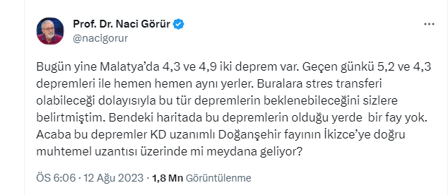 "Bugün yine Malatya’da 4,3 ve 4,9 iki deprem var. Geçen günkü 5,2 ve 4,3 depremleri ile hemen hemen aynı yerler. Buralara stres transferi olabileceği dolayısıyla bu tür depremlerin beklenebileceğini sizlere belirtmiştim. Bendeki haritada bu depremlerin olduğu yerde bir fay yok. Acaba bu depremler KD uzanımlı Doğanşehir fayının İkizce’ye doğru muhtemel uzantısı üzerinde mi meydana geliyor?"