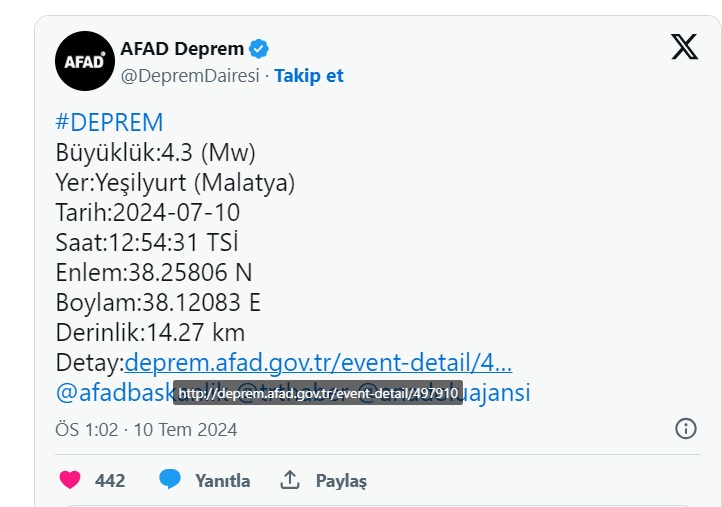 Afet ve Acil Durum Yönetimi Başkanlığı (AFAD), Malatya'nın Yeşilyurt ilçesinde öğlen saatlerinde 4.3 büyüklüğünde deprem meydana geldiği açıklandı.
