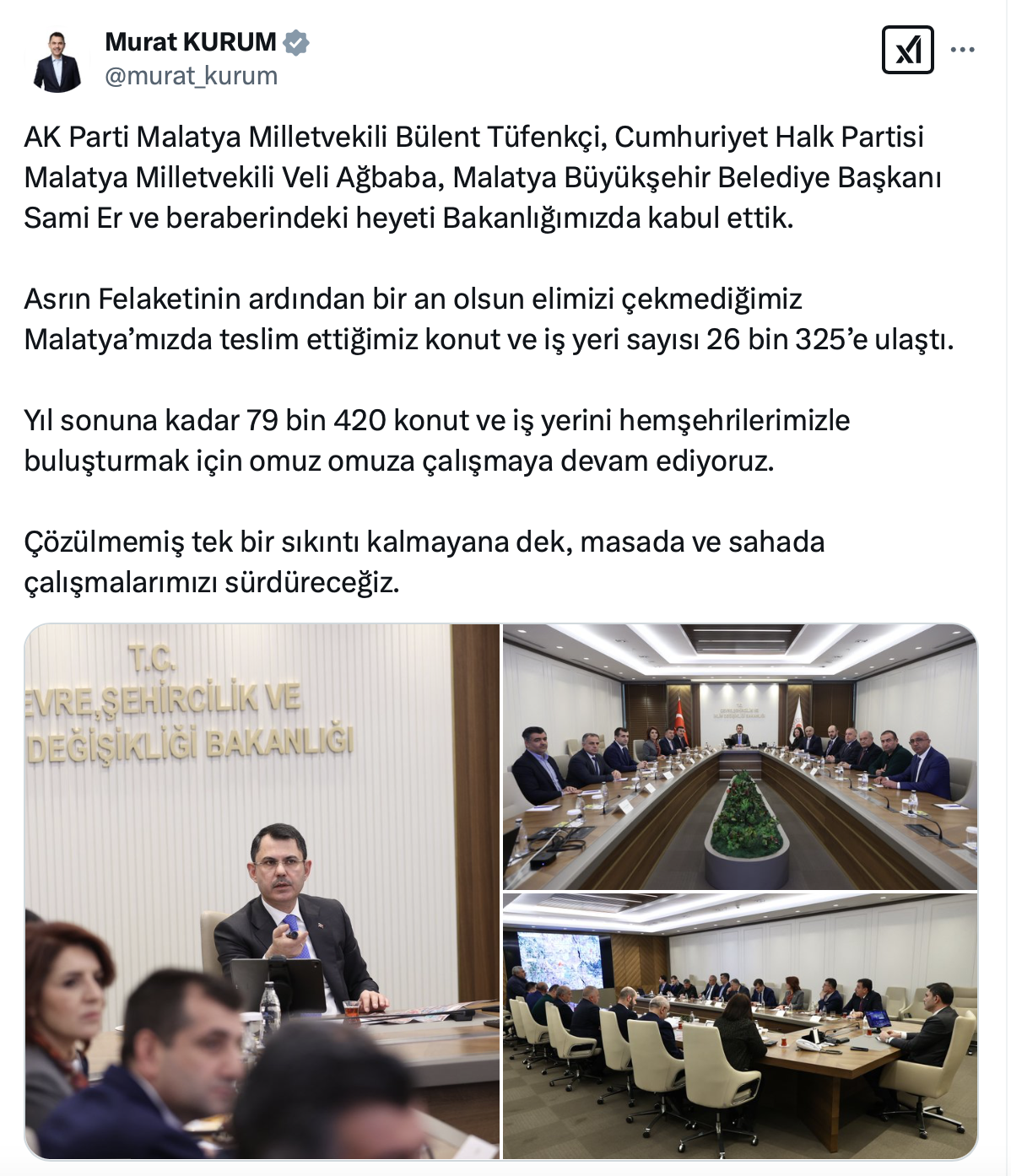 Murat Kurum paylaşımında şu ifadeleri kullandı: "AK Parti Malatya Milletvekili Bülent Tüfenkçi, CHP Malatya Milletvekili Veli Ağbaba, Malatya Büyükşehir Belediye Başkanı Sami Er ve beraberindeki heyeti Bakanlığımızda kabul ettik.