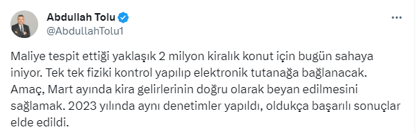 Hazine ve Maliye Bakanlığı, kira gelirini beyan etmeyen mülk sahiplerine karşı denetimlere başladı. Gazeteci Abdullah Tolu dün başlayan denetimlerle ilgili X sosyal medya hesabından bir paylaşım yaptı, vatandaşlar tepkilerini dile getirdi.