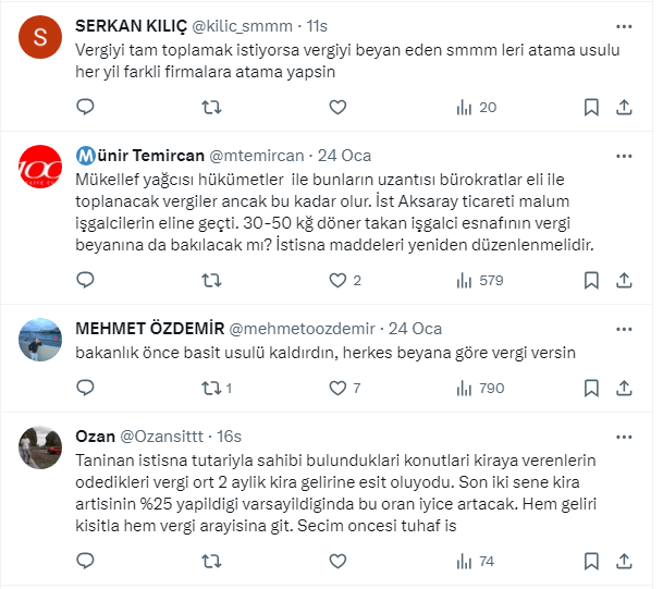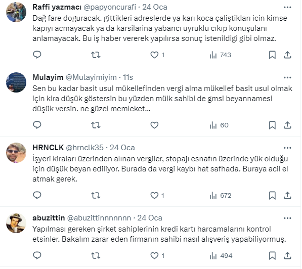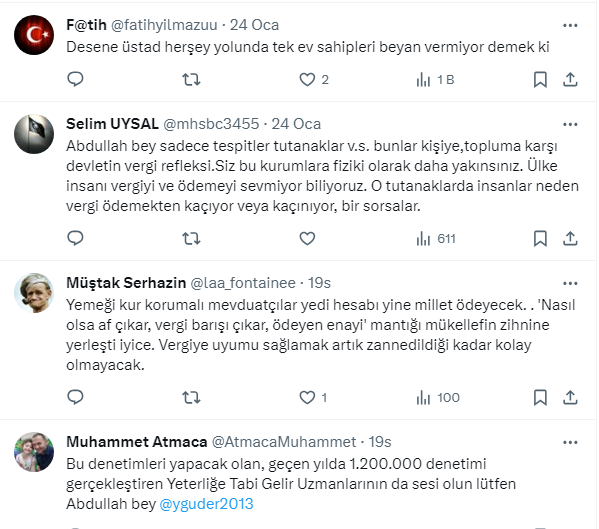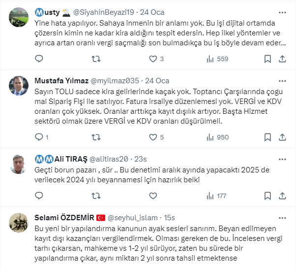 Denetimlerin, Mart ayında kira gelirlerinin doğru olarak beyan edilmesini sağlamak amacıyla yapıldığını belirten Gazeteci Abdullah Tolu, twitter.com/AbdullahTolu1 X Sosyal medya hesabından yaptığı paylaşımda 2023 yılındaki denitimlerde başarılı sonuçlar alındığını ifade etti. Gazeteci Abdullah Tolu’nun gönderisine takipçilerinden bazıları, vergi alınacak bir tek ev sahipleri mi kaldı, vergi alacak yer arıyorlarsa binlerce mükellef gözlerinin önünde, önce istisnaları kaldırsınlar diye tepki gösterdi.