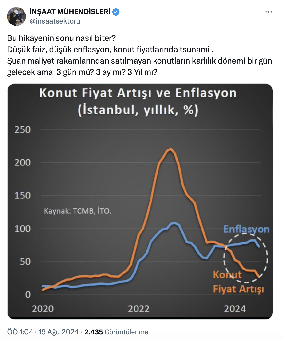 İnşaat Mühendisleri sosyal medya hesabı https://x.com/insaatsektoru üzerinden yaptığı paylaşımda Şu an maliyet rakamlarından satılmayan konutların karlılık döneminin bir gün geleceğini söyleyerek, “3 gün mü? 3 ay mı? 3 Yıl mı?” ifadelerini kullandı.