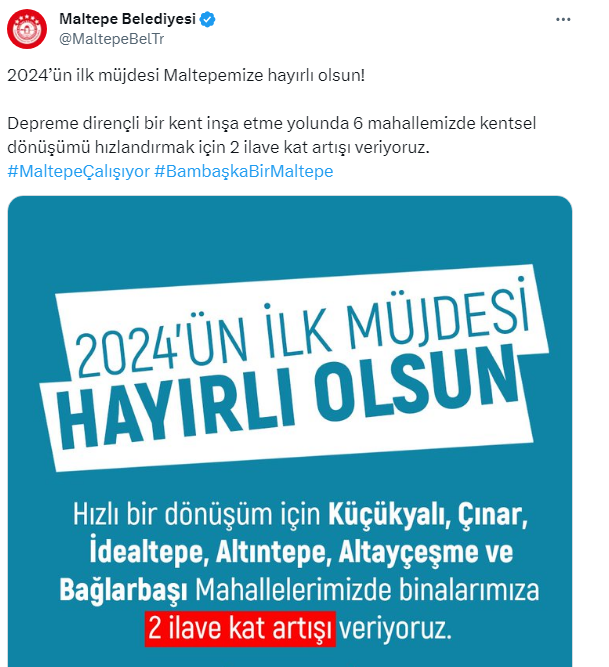 ''2024’ün ilk müjdesi Maltepemize hayırlı olsun! Depreme dirençli bir kent inşa etme yolunda 6 mahallemizde kentsel dönüşümü hızlandırmak için 2 ilave kat artışı veriyoruz. #MaltepeÇalışıyor #BambaşkaBirMaltepe''