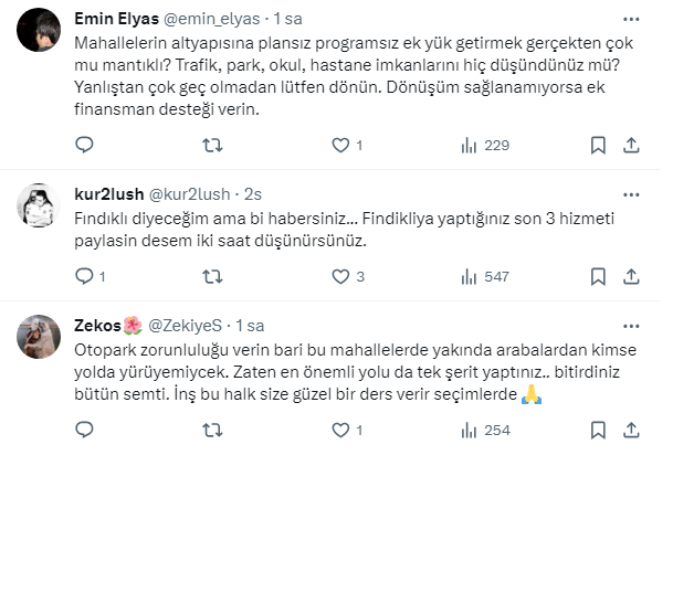 Emin Elyas @emin_elyas: ''Mahallelerin altyapısına plansız programsız ek yük getirmek gerçekten çok mu mantıklı? Trafik, park, okul, hastane imkanlarını hiç düşündünüz mü? Yanlıştan çok geç olmadan lütfen dönün. Dönüşüm sağlanamıyorsa ek finansman desteği verin.