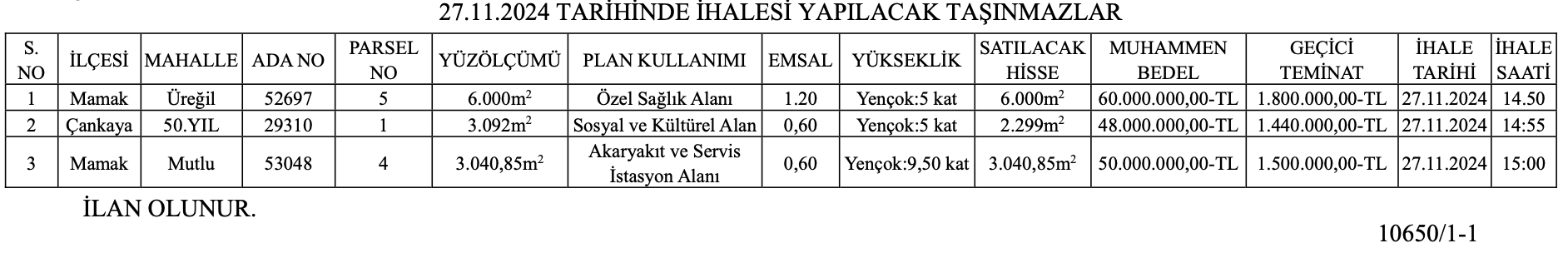 Mamak Belediye Başkanlığı, Ankara Mamak ve Çankaya’da yer alan üç adet arsayı satışa çıkardı. Arsaların satış ihaleleri 26 Kasım 2024 tarihinde gerçekleştirilecek.