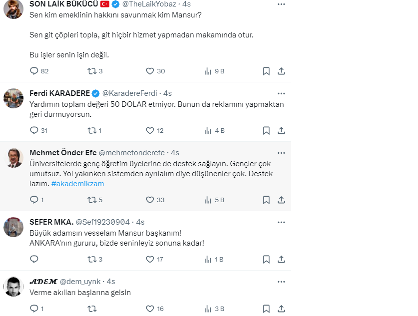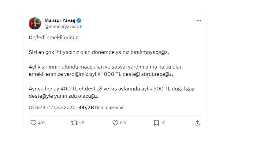 Ankara Büyükşehir Belediyesi Başkanı Mansur Yavaş emeklilere müjdeyi verdi. Her ay düzenli olarak verilen sosyal destek ödemeleri kapsamında emeklilere et desteğinden doğlagaz desteğine kadar ödemelere devam edileceğini açıkladı. Mansur Yavaş destek ödemesini ''Değerli emeklilerimiz'' başlığı altında sosyal medya hesabından duyurdu. Paylaşımın altına ise 500'e yakın yorum geldi. İşte o paylaşım ve gelen yorumlar...