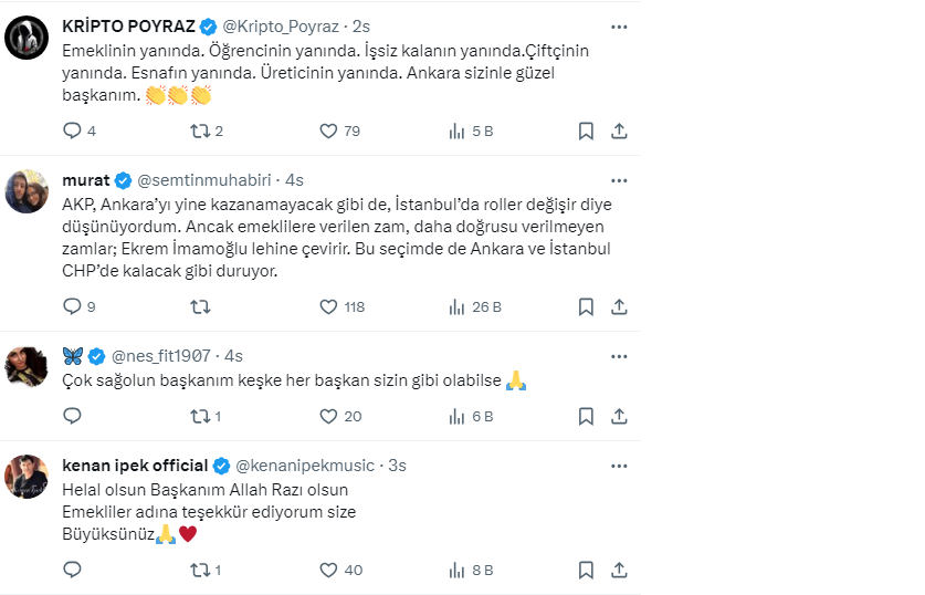 KRİPTO POYRAZ @Kripto_Poyraz: ''Emeklinin yanında. Öğrencinin yanında. İşsiz kalanın yanında.Çiftçinin yanında. Esnafın yanında. Üreticinin yanında. Ankara sizinle güzel başkanım. ''