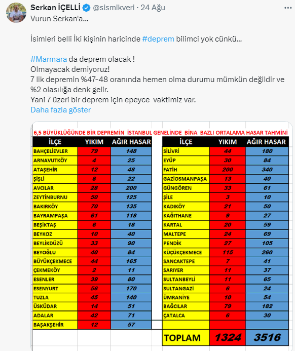 Maden Teknolojisi ve Yer Bilimleri Uzmanı Serkan İçelli, sosyal medya hesabından, Marmara'da 7 şiddetinde depremin hemen olma olasılığının yüzde 47-48 olduğunu belirterek 6.5 şiddetinde deprem olması halinde, hangi ilçenin ne kadar etkileneceğini açıkladı.
