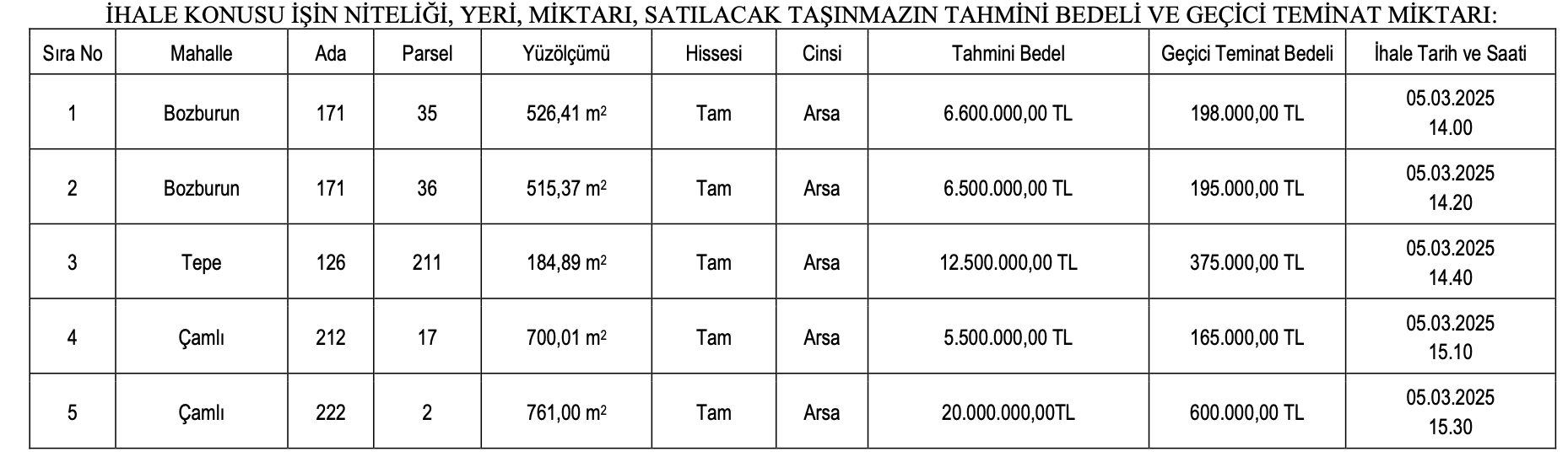 Marmaris Belediye Başkanlığı, Marmaris’te yer alan beş adet arsayı satışa çıkardı. Muhammen bedelleri 5 milyon 500 bin TL’den başladığı arsaların satış ihaleleri 5 Mart’ta yapılacak.