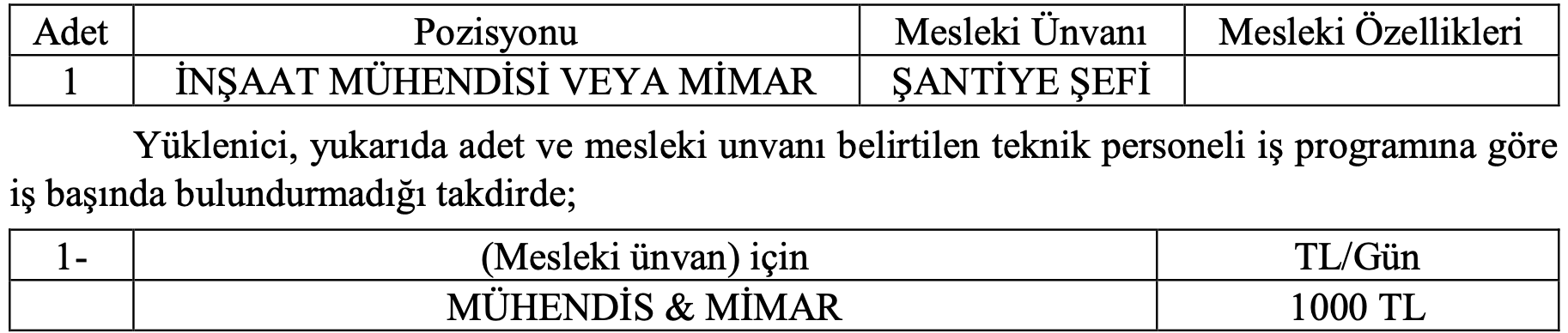 Yüklenici, İdareye bildirdiği teknik personelin onaylandığının kendisine bildirildiği tarihten itibaren aşağıda adet ve unvanları belirtilen teknik personeli iş programına göre iş yerinde bulundurmak zorundadır.