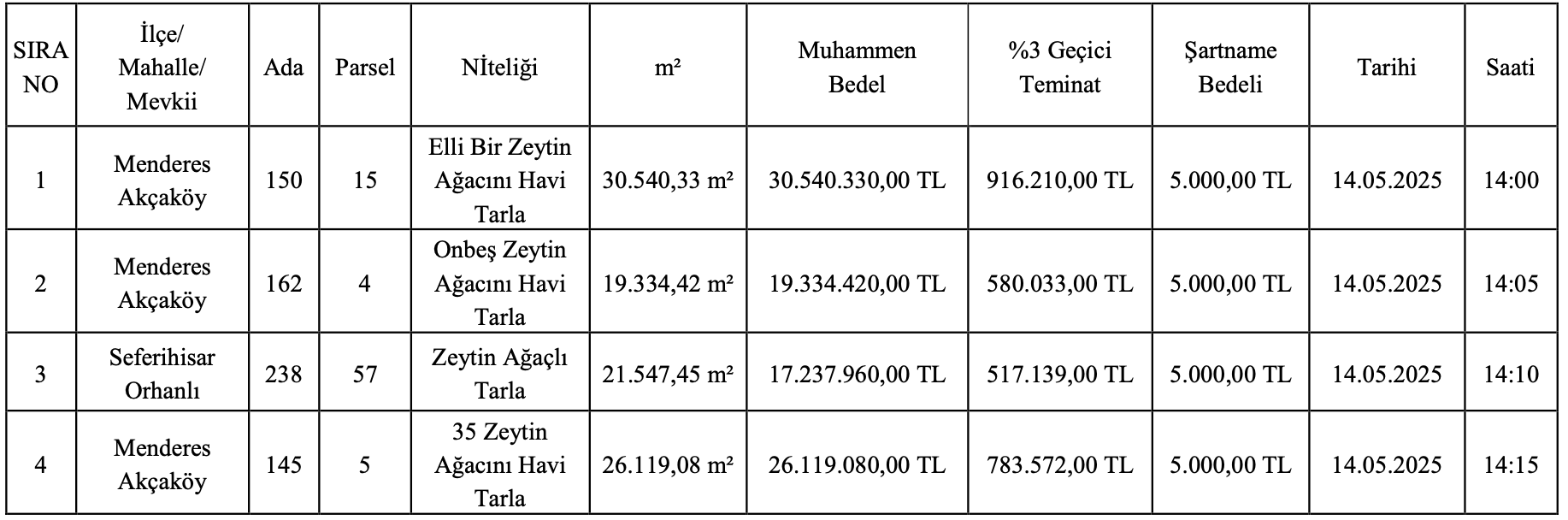 Şartname bedelinin 5 bin TL olarak açıklandığı arazilerin satış ihaleleri 14 Mayıs 2025 tarihinde saat 14.00 ile 14.15 arasında Menderes Belediyesi Encümen Salonunda yapılacak gerçekleştirilecek.