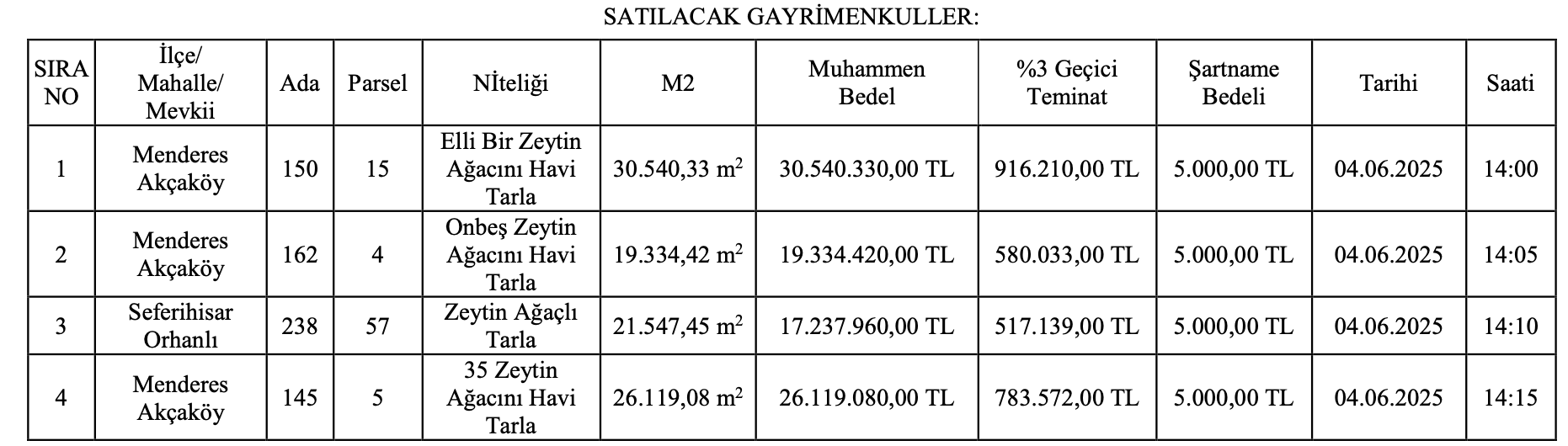 Menderes Akçaköy ve Seferihisar Orhanlı’da yer alan arsaların satış ihaleleri 4 Haziran 2025 tarihinde saat 14.00 ile 14.15 arasında gerçekleştirilecek.