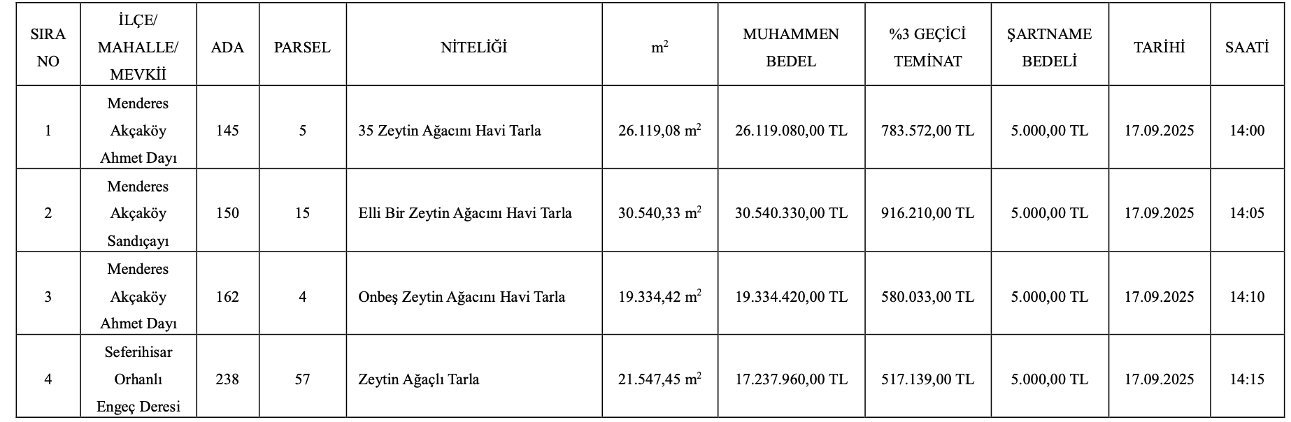 1- İHALE KONUSU VE ŞEKLİ: İzmir ili, Seferihisar ilçesi Orhanlı Mahallesi ve Menderes İlçesi Akçaköy Mahallesinde bulunan aşağıda belirtilen