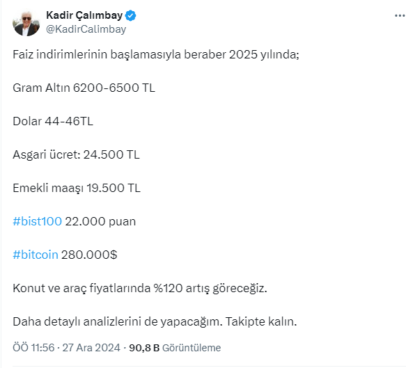 Çalımbay, sosyal medya hesabı X'ten 2025 yılında, konut ve araç fiyatlarında yüzde 120 artış olacağını açıkladı. İşte o paylaşım....