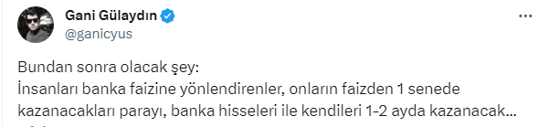 Faiz artırımıyla birlikte banka hisselerinde yükselişin başlayacağını söyleyen Borsa eğitmeni Gani Gülaydın, twitter.com/ganicyus X sosyal medya hesabından yaptığı paylaşımda, insanları mevduat faizine yönlendirenlerin, onların faizden 1 senede kazanacaklarını banka hisseleriyle 1-2 ayda kazanacaklarını ifade etti.