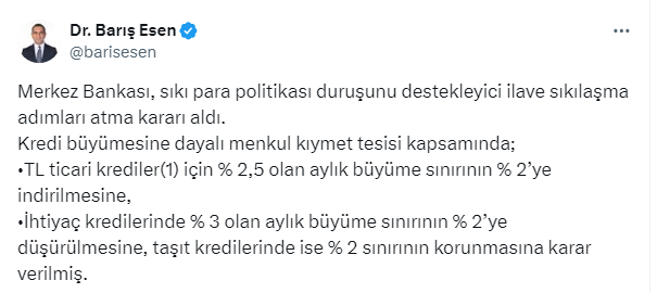 Merkez Bankası aldığı kararla sıkı para politikası duruşunu destekleyici ilave sıkılaştırma adımları attığını duyurdu. İhtiyaç ve taşıt kredilerinde büyüme sınırlarını düşürdü. Gazeteci Barış Esen haberi sosyal medya hesabından duyurdu, takipçileri bu duruma ne dedi?