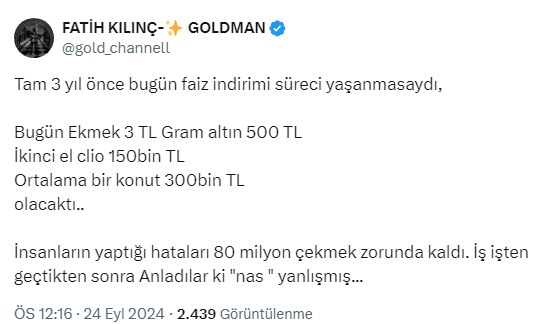 Analist Fatih Kılınç tam üç sene önce bugün Merkez Bankası'nın faizleri düşürdüğünü anımsatarak sonuçlarında neler olduğunu açıkladı. Kılınç, Merkez Bankası üç sene önce faiz indirimi yapmaysadı ortalama bir konutun fiyatının 300 bin lira, ekmeğin fiyatının 3 lira, gram altının 500 lira olacağını söyledi.