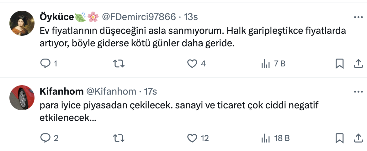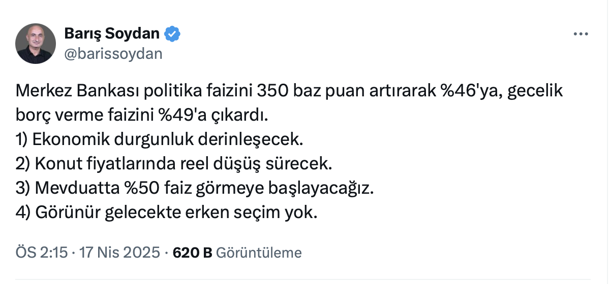 Barış Soydan yaptığı paylaşımda yaptığı paylaşımda Merkez Bankası’nın politika faizini 350 baz puan artırarak yüzde 46'ya çıkardığını belirterek, konut fiyatlarında reel düşüşün süreceğini kaydetti.