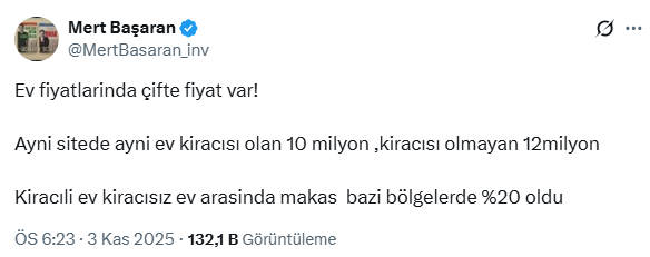 Ekonomist Mert Başaran, satılık kiracılı ev ile satılık kiracısız ev fiyatları arasında makasın yüzde 20'ye ulaştığını söyleyerek 'Ev fiyatlarında çifte fiyat var.'' dedi.