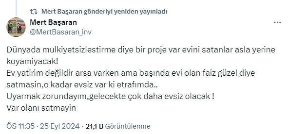 Konut piyasasında satışlar artmaya başladı. Ev sahipleri de piyasadaki bu rüzgara kapılıp konutlarını satmaya başlarken Ekonomist Mert Başaran'dan uyarı geldi. Başaran, ev sahiplerine 'var olanı satmayın' diyerek altını çizerek uyardı.