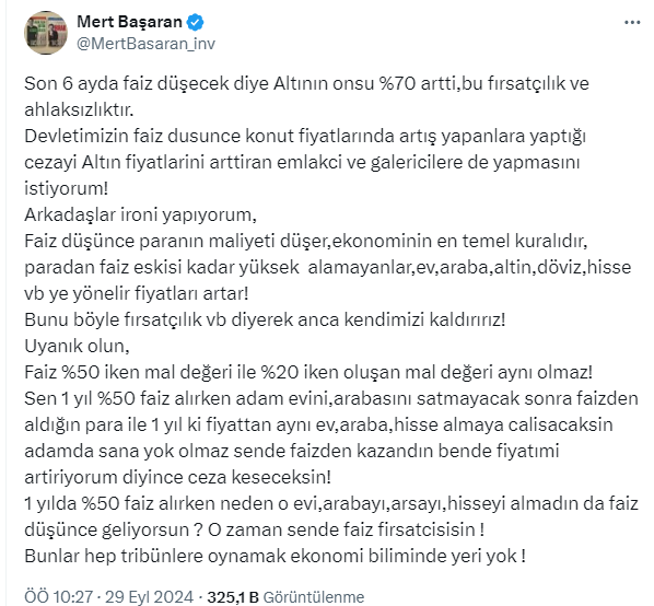 Mert Başaran,a altın fiyatlarındaki yükselişi fırsata çevirenlere sitem ederek, emlak fırsatçılarına uygulanan cezanın altın fıratçıları için de uygulanması gerektiğine vurgu yaptı.