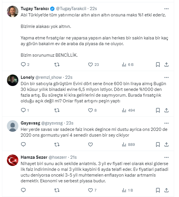 Devletimizin faiz dusunce konut fiyatlarında artış yapanlara yaptığı cezayi Altın fiyatlarini arttiran emlakci ve galericilere de yapmasını istiyorum!