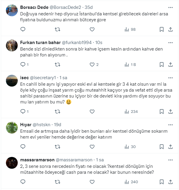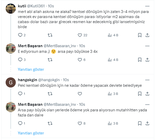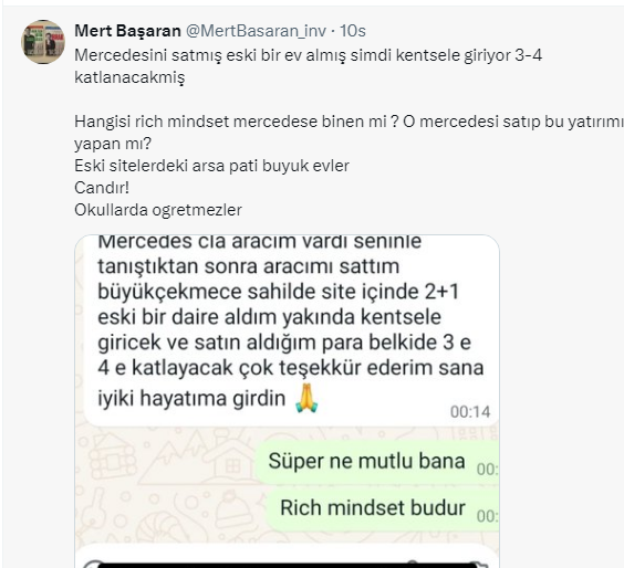 Bir yatırımcısının kendisine attığı mesajı paylaşan Başaran, ''Mercedes'ini satmış eski bir ev almış simdi kentsele giriyor 3-4 katlanacakmiş.'' diyerek açıkladı. Başaran, mesajı sosyal medyadan paylaşarak ''Eski sitelerdeki arsa pati buyuk evler Candır! Okullarda öğretmezler' diyerek yatırımcıları uyardı ve şu soruyu sordu: Hangisi rich mindset Mercedes'e binen mi? O Mercedes'i satıp bu yatırımı yapan mı? İşte Başaran'ın sosyal medya hesabı X'ten yaptığı o paylaşım ve takipçilerinden gelen yorumlar...